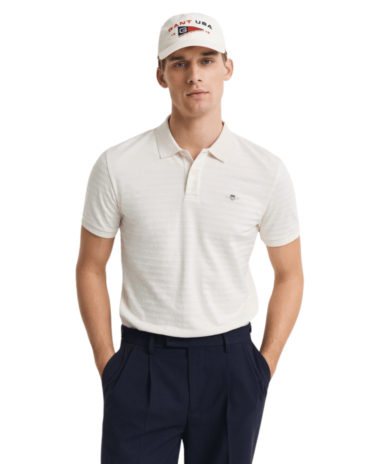 חולצת פולו לבנה לגברים מבית GANT, בעיצוב על-זמני שמשלב אלגנטיות ונוחות.