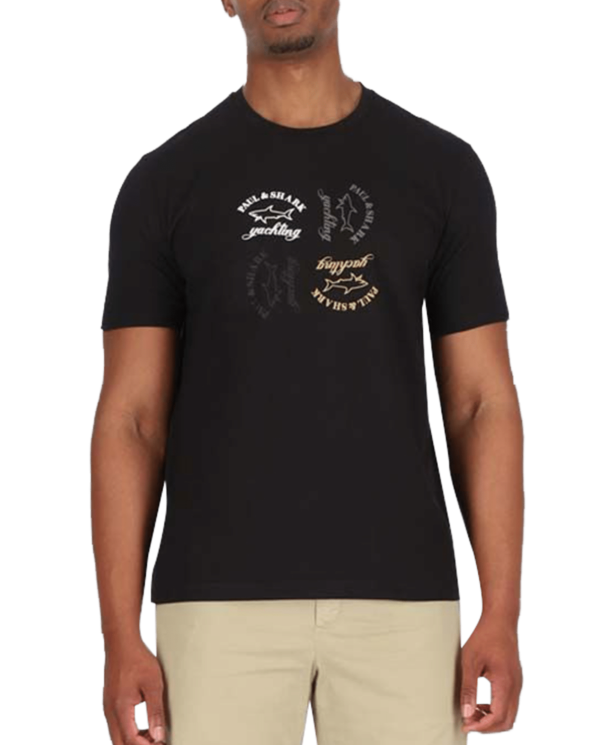 טי-שירט לגברים בצבע שחור עם לוגו מודפס בולט בחזית, שמשדר נוכחות, ביטחון ואופנה יוקרתית.