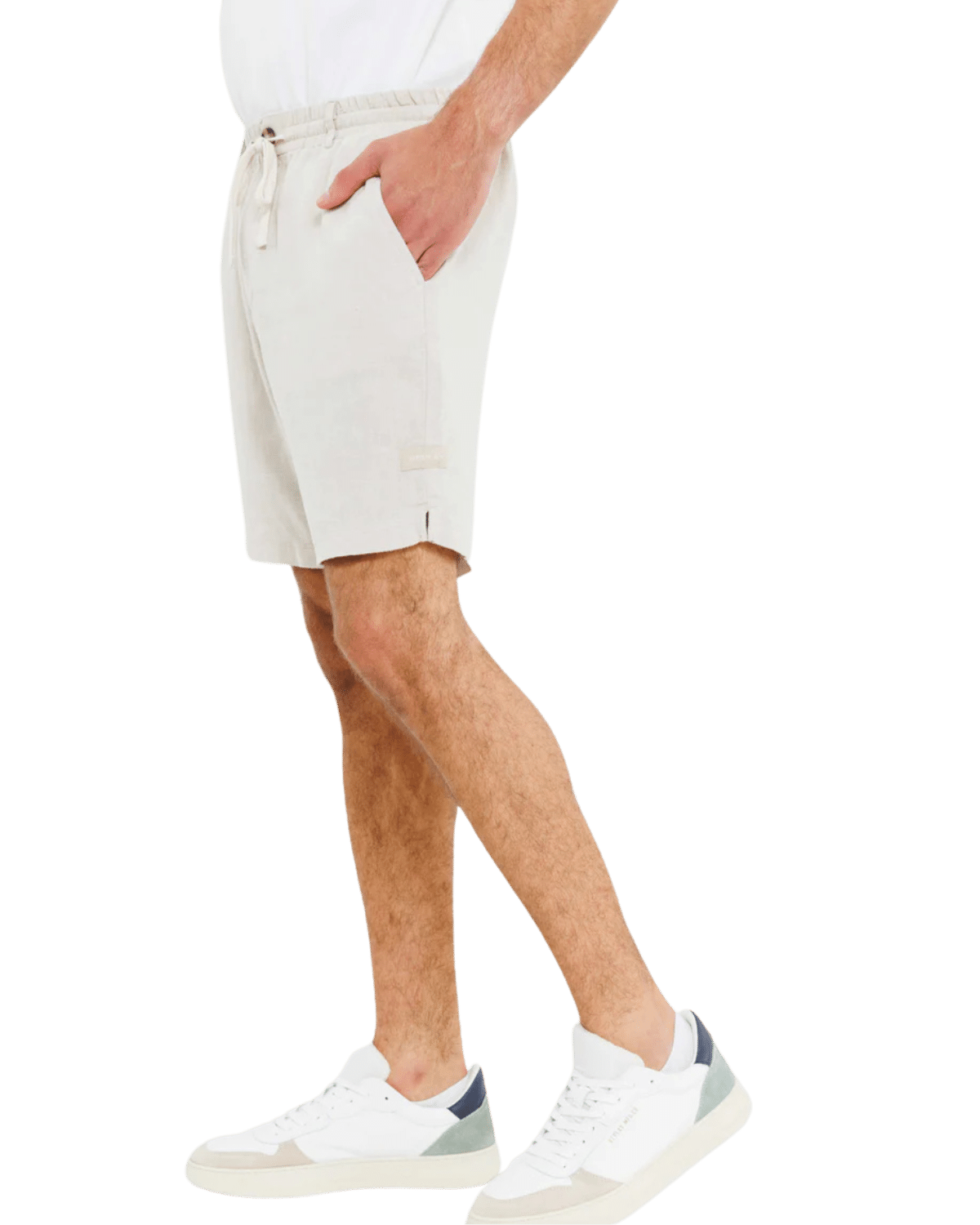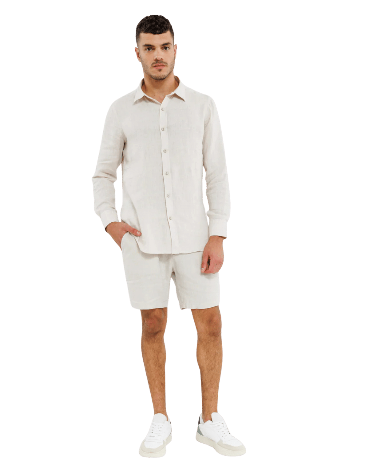 מכנסי פשתן קצרים לגברים בצבע קרם, עם גזרה קלאסית ונוחה המעניקה מראה טבעי ורגוע.