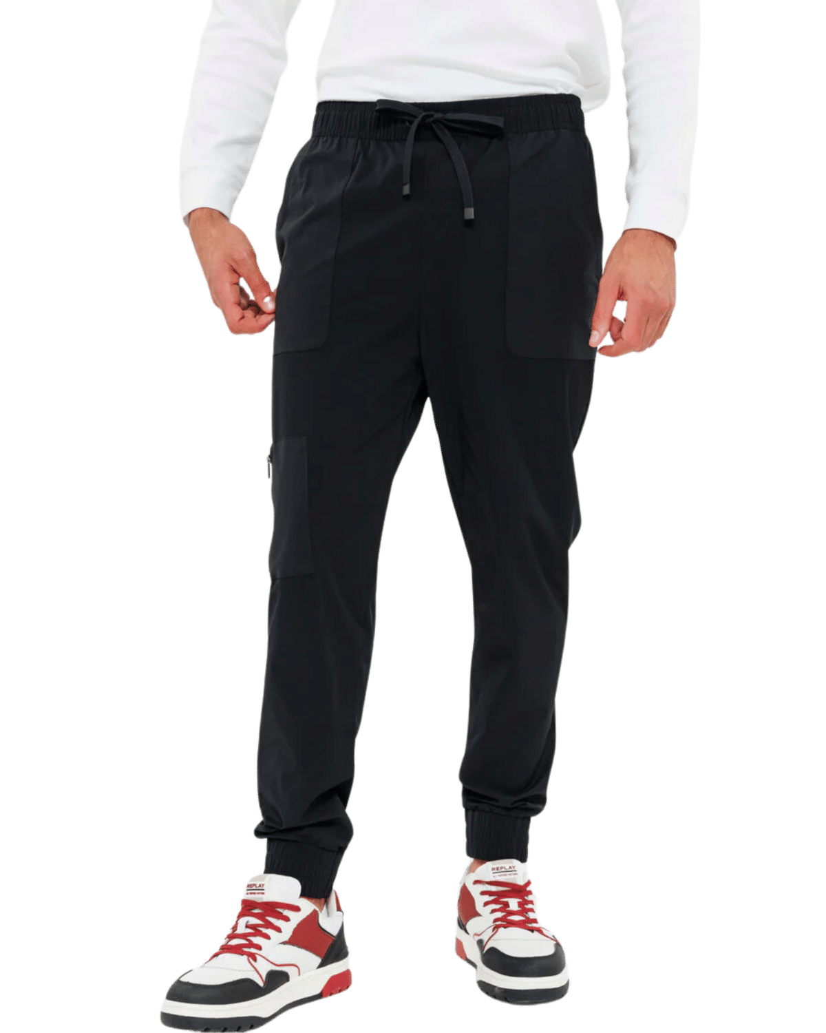 מכנסי נילון לגברים בגוון שחור, עשויים מבד נעים וגמיש, עם עיצוב מודרני.