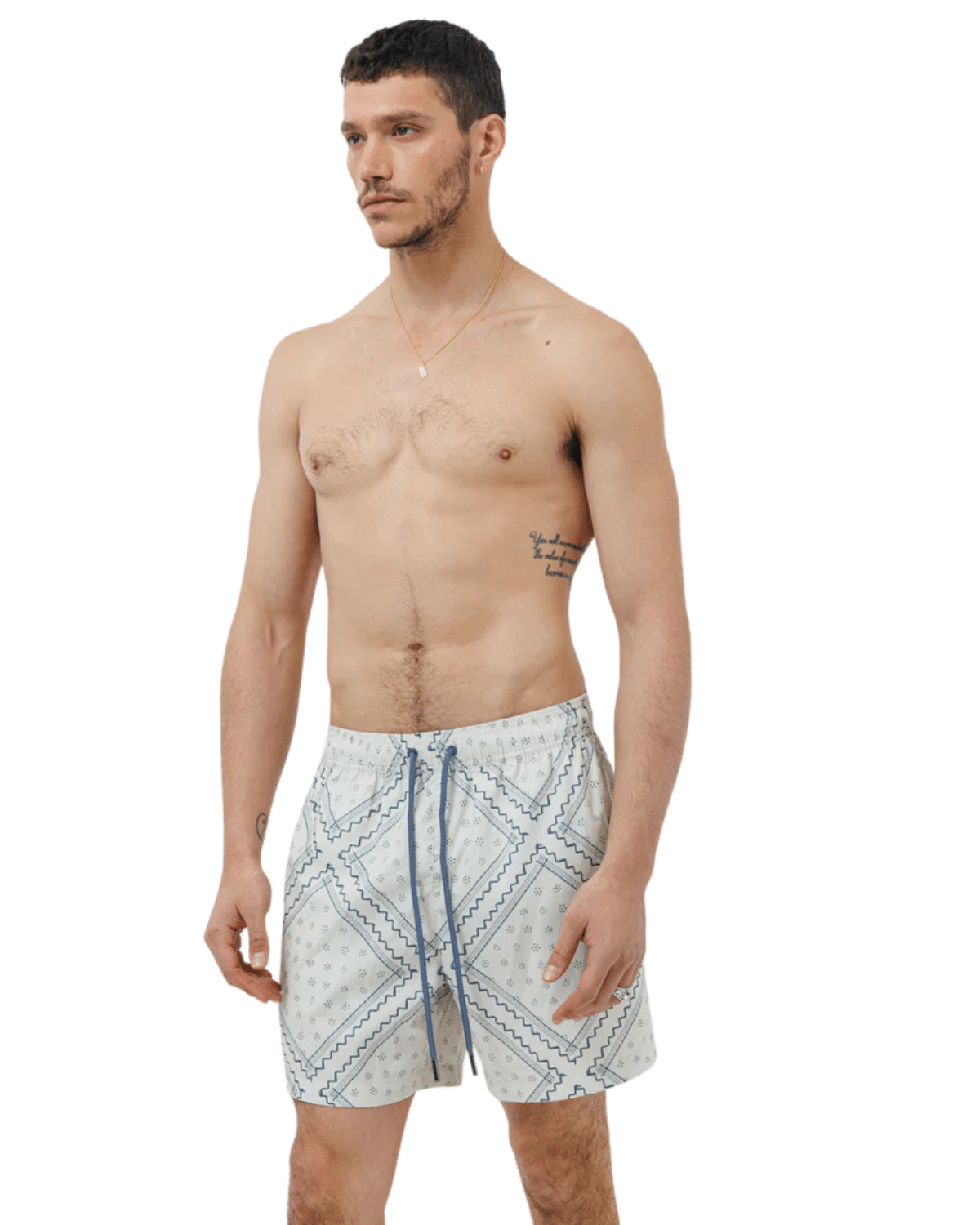 שורט ים לגברים בצבע לבן עם דפוס תכלת עדין ומרענן, בעיצוב שמשלב קלילות קייצית עם ניחוח איטלקי יוקרתי.