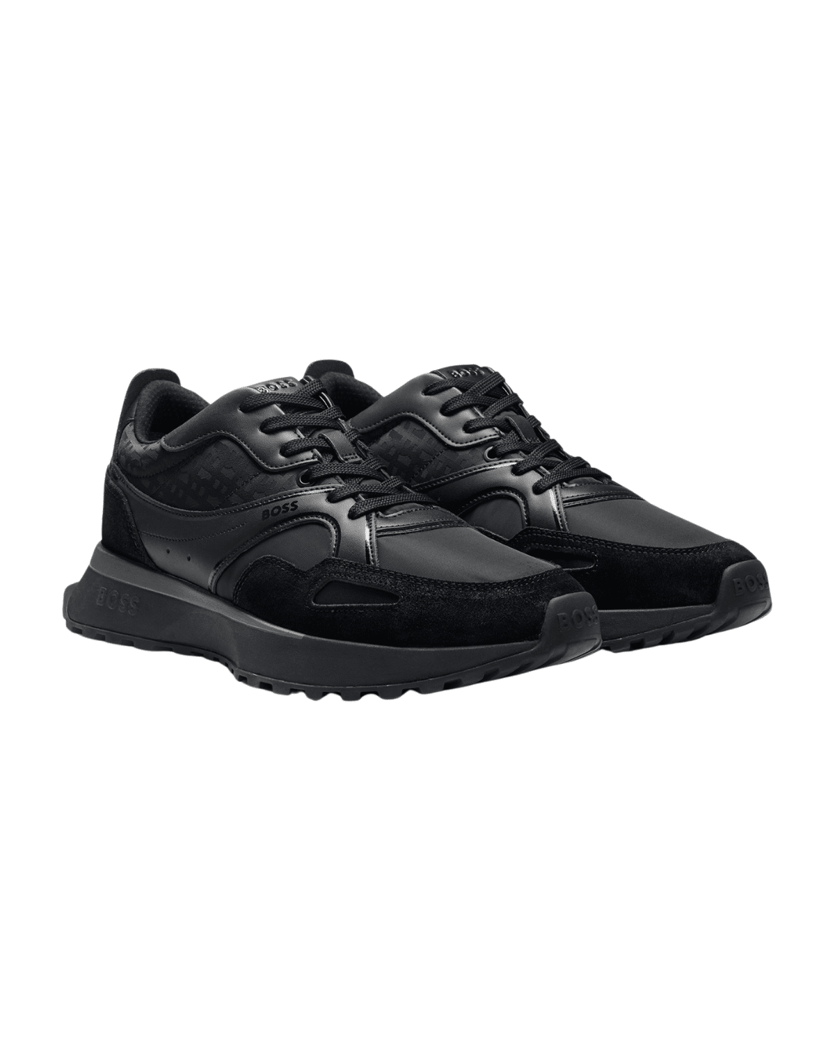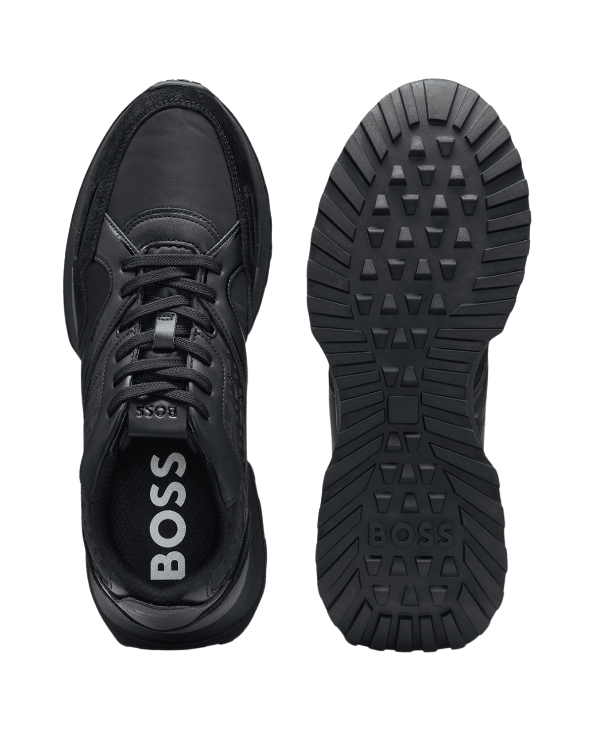 נעלי סניקרס לגברים מבית BOSS בגוון שחור, המשלבות חלק עליון עשוי עור איכותי ורשת לנידוף אדים.