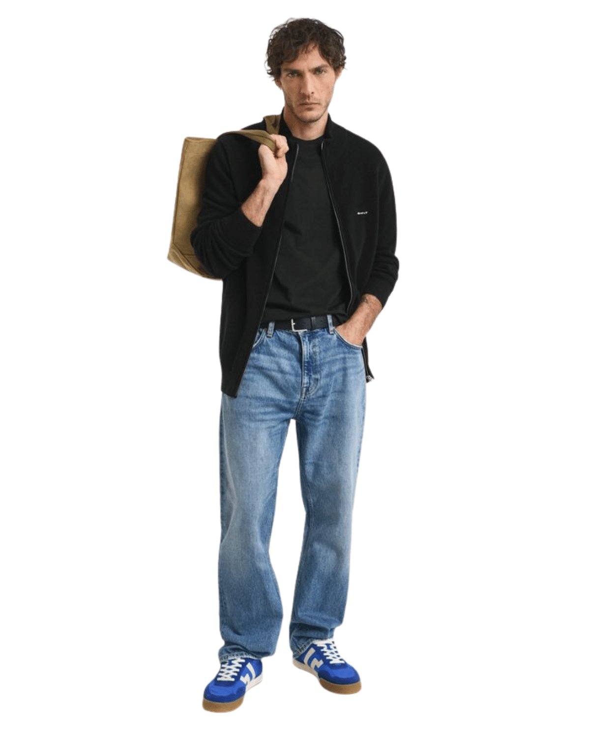 הדגם מגיע בגזרה רגילה (Regular Fit) עם שרוולים ארוכים, סגירת רוכסן מלאה לאורך החזה, וצווארון עומד בסריגת ריב עם פס פנימי בצבע קונטרסטי.