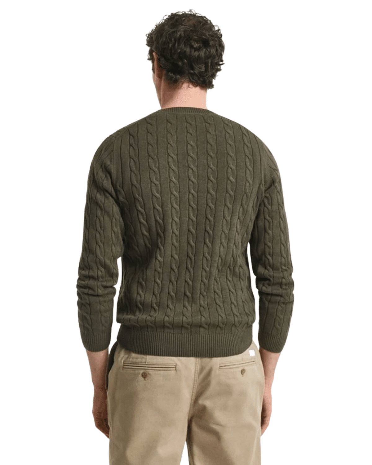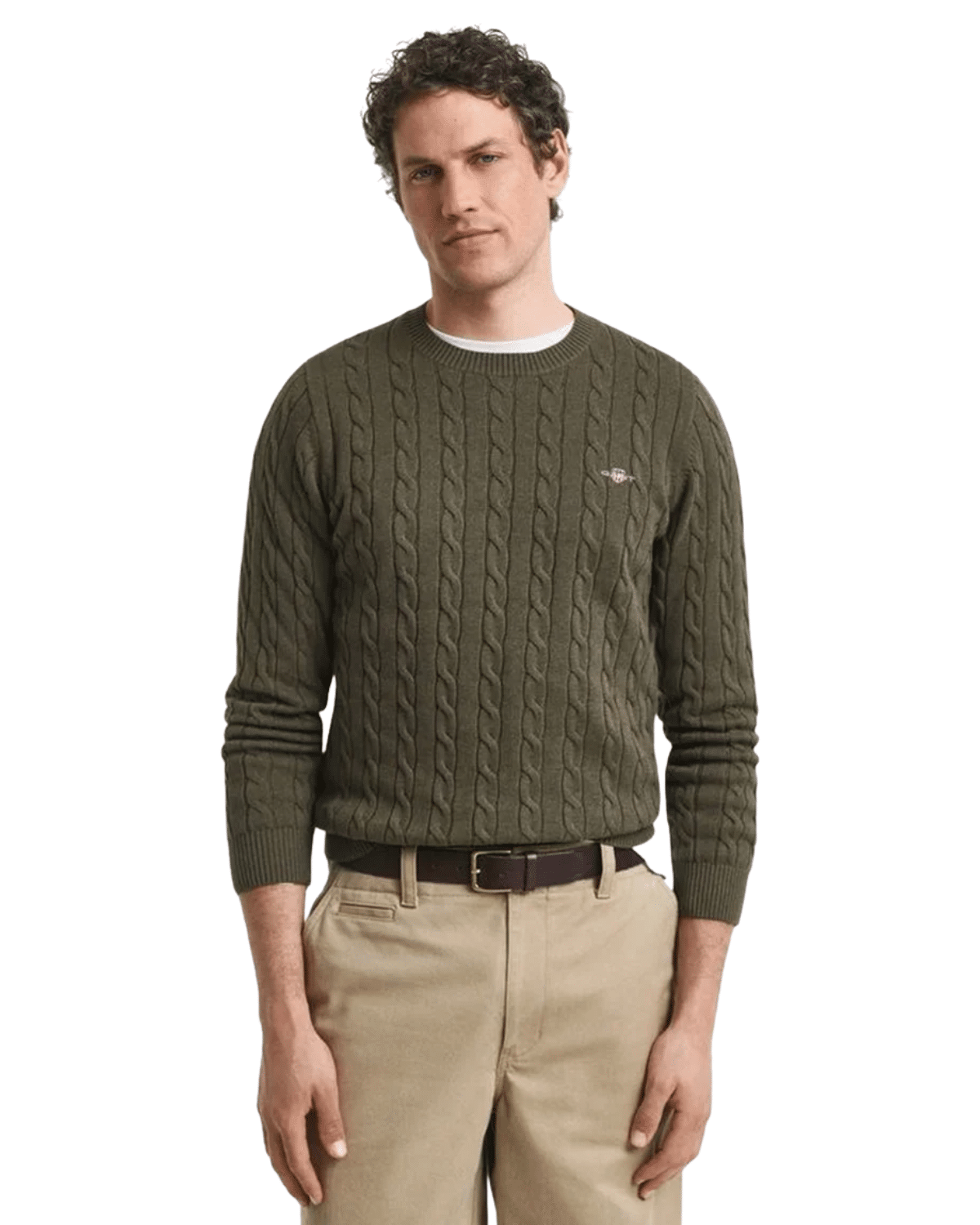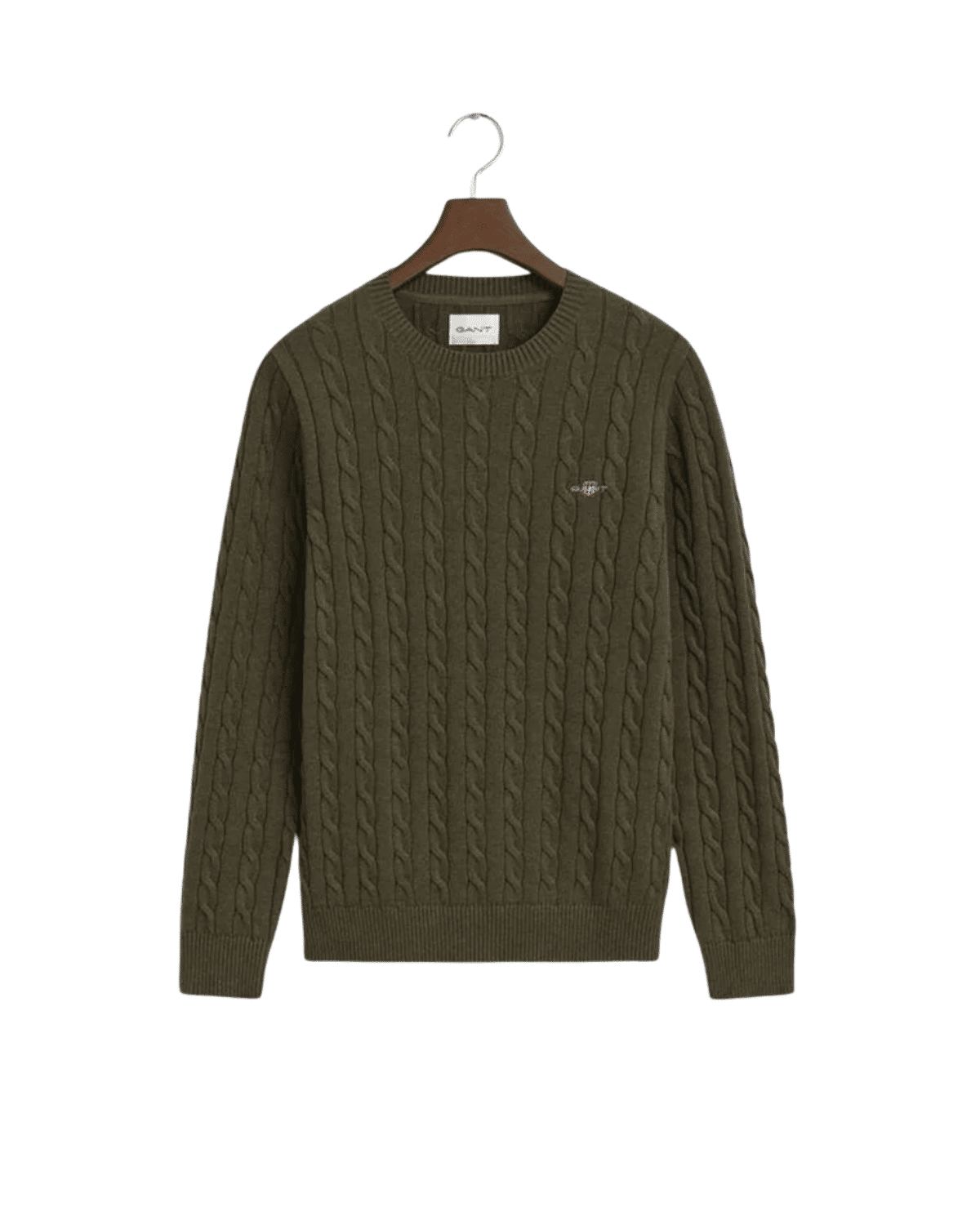 סריג גברי בעיצוב קלאסי מבית GANT בסגנון Cable Knit עם מבנה סריגת צמות לאורך כל הפריט.