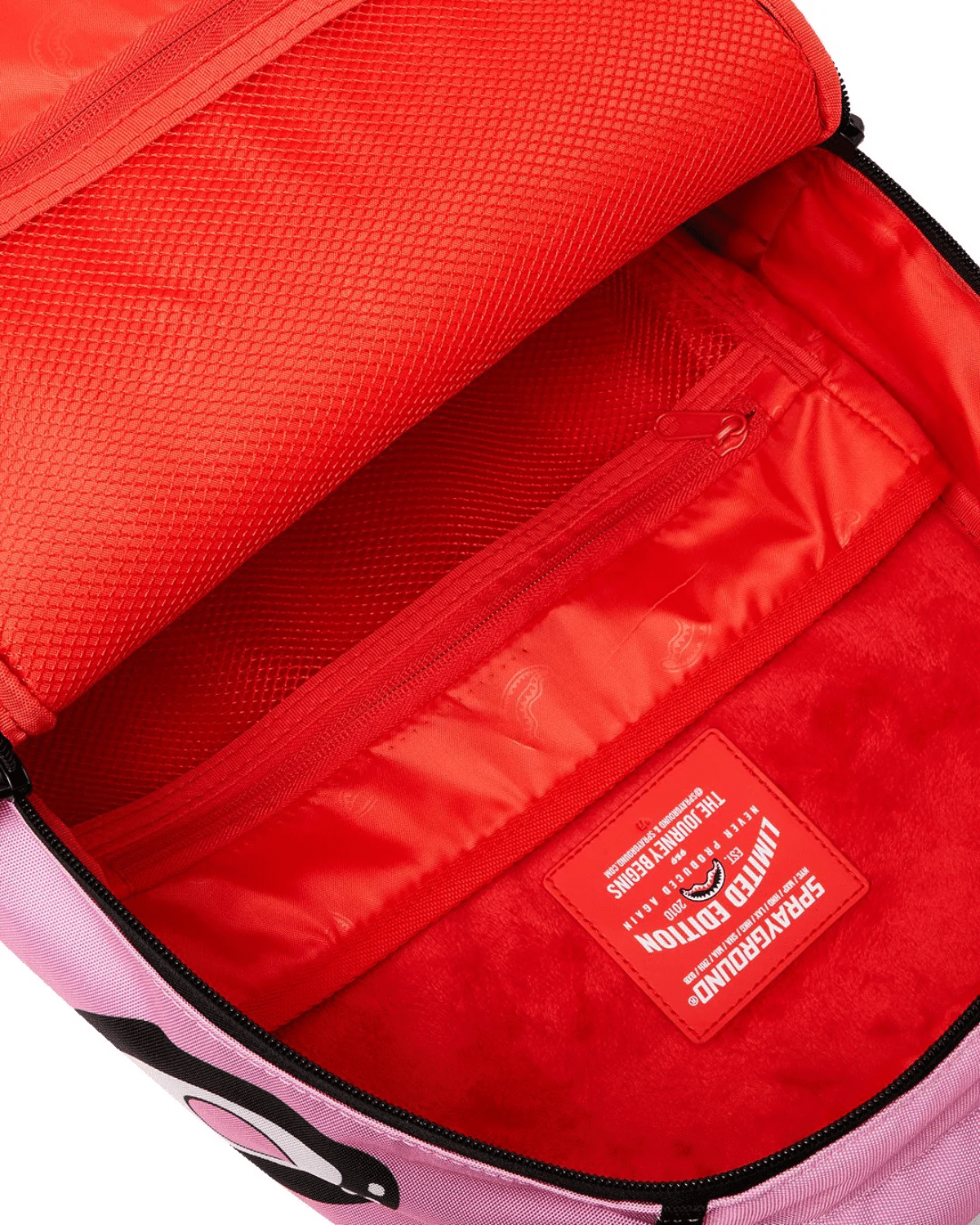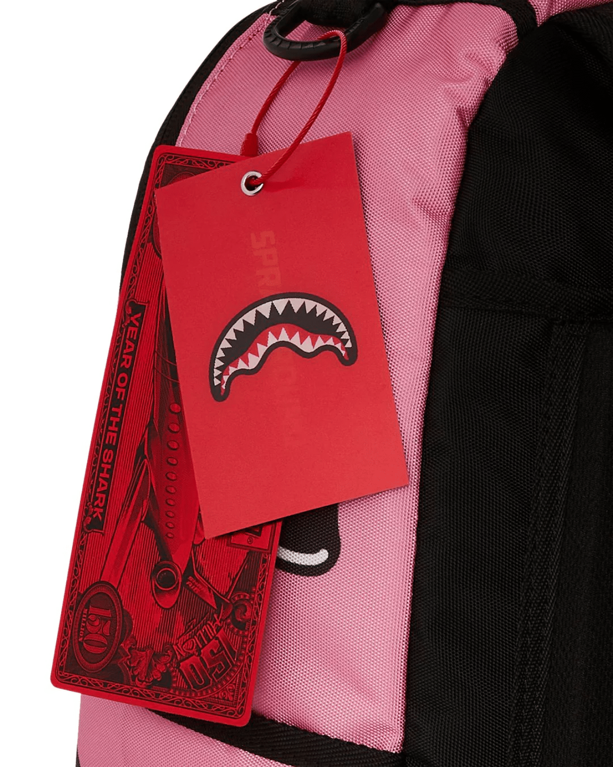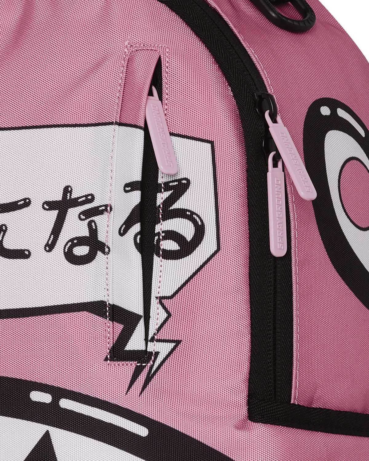 תיק גב ייחודי בגוון ורוד בועתי עם מוטיב כריש עוצמתי ובלסת פתוחה בחזית. בועת דיבור קטנה עם כתב יפני מוסיפה תחושה גרפית וקצת שיק קומיקאי.