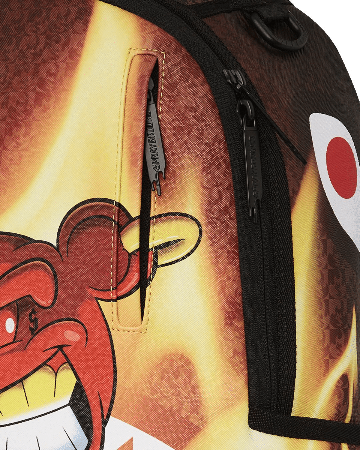 תיק גב בועט בעיצוב עוצמתי במיוחד מבית SPRAYGROUND, המשלב להבות לוהטות עם קרע דרמטי בצורת לוע הכריש האייקוני.
