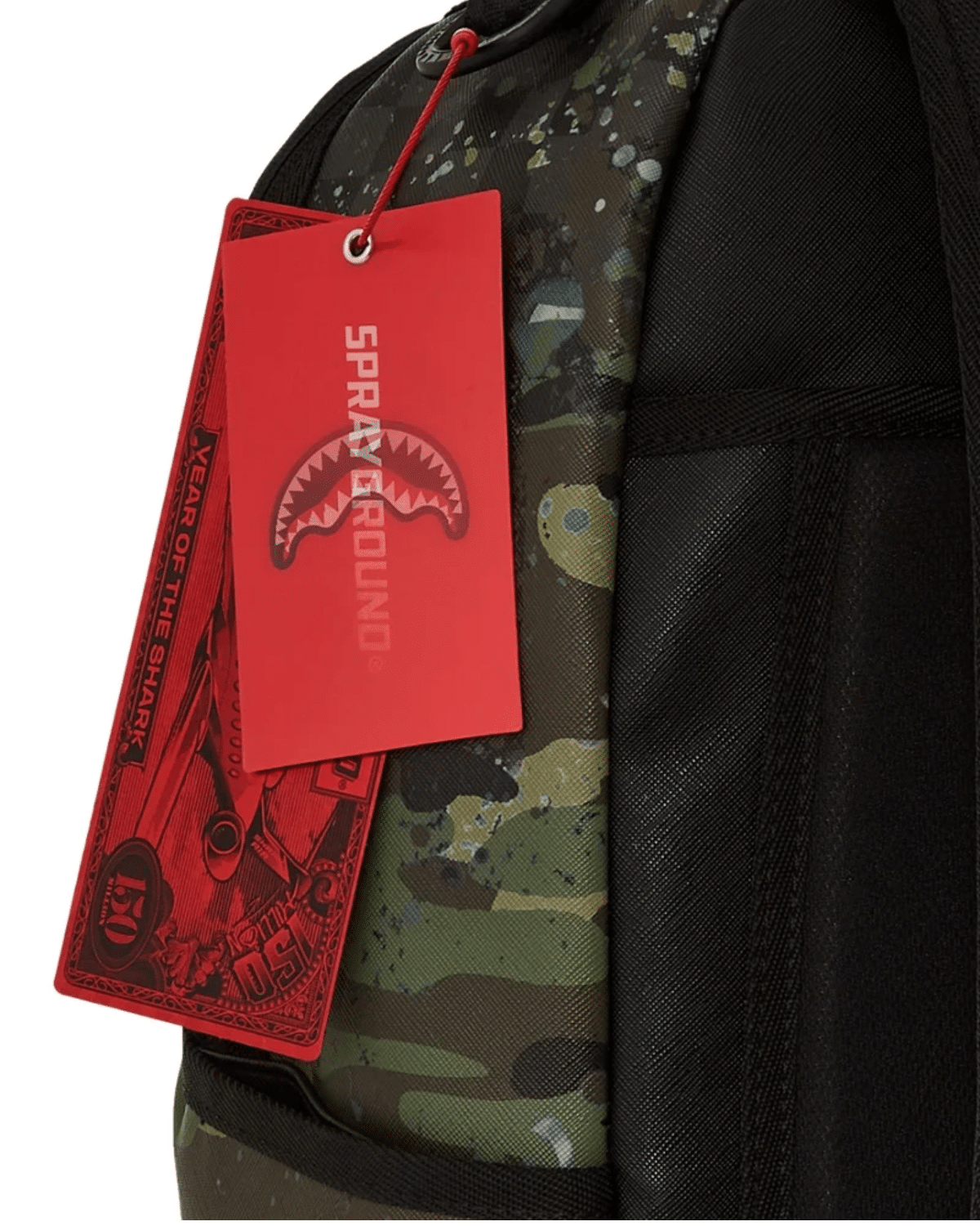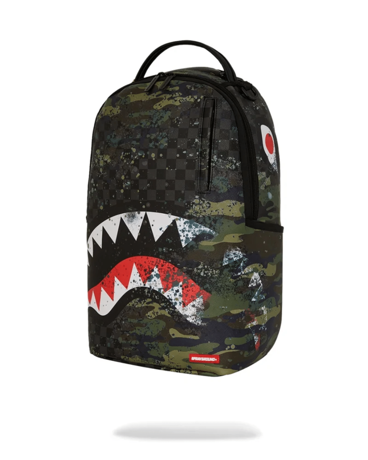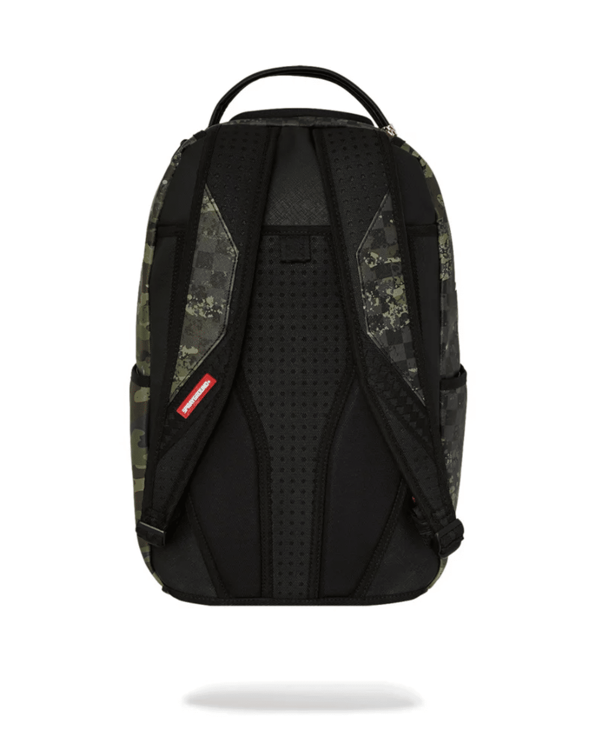 תיק גב יוניסקס מבית SPRAYGROUND בעיצוב מודרני עם הדפס קמופלאז' צבעוני ומרשים המשלב גוונים ירוקים ושחור.