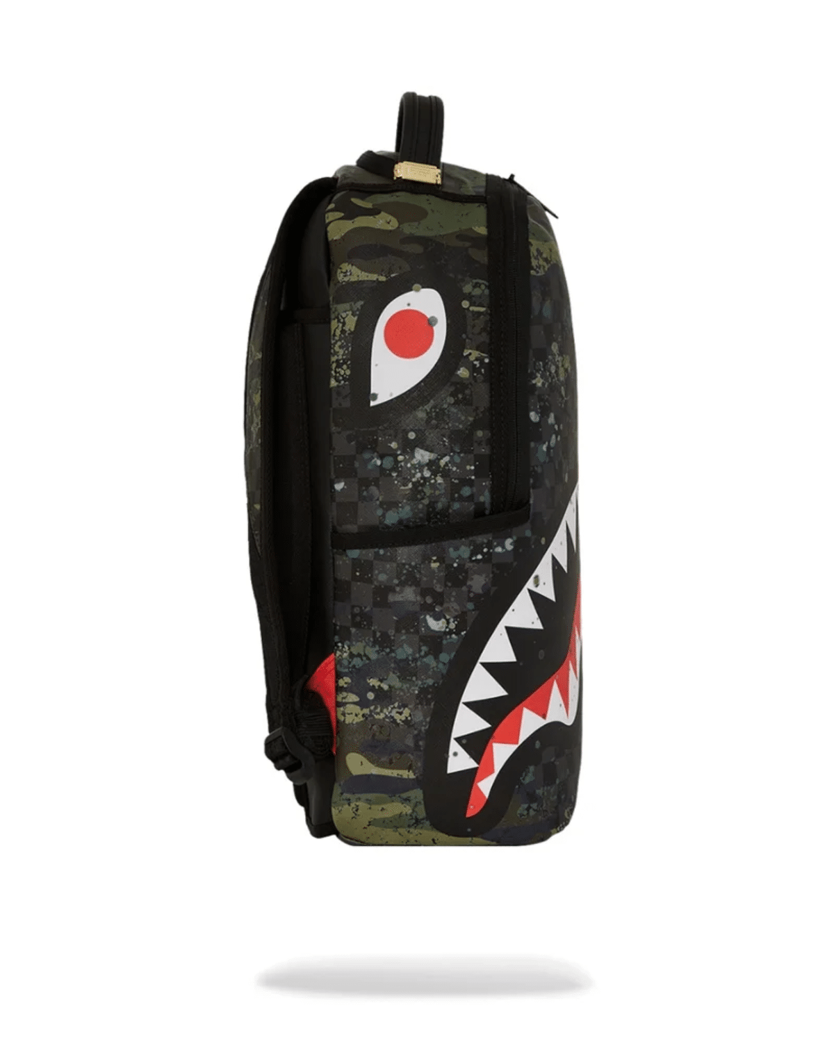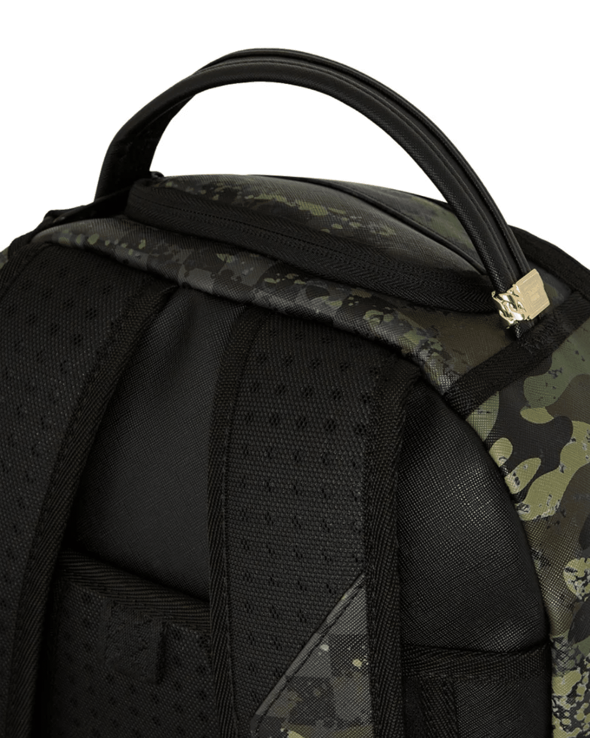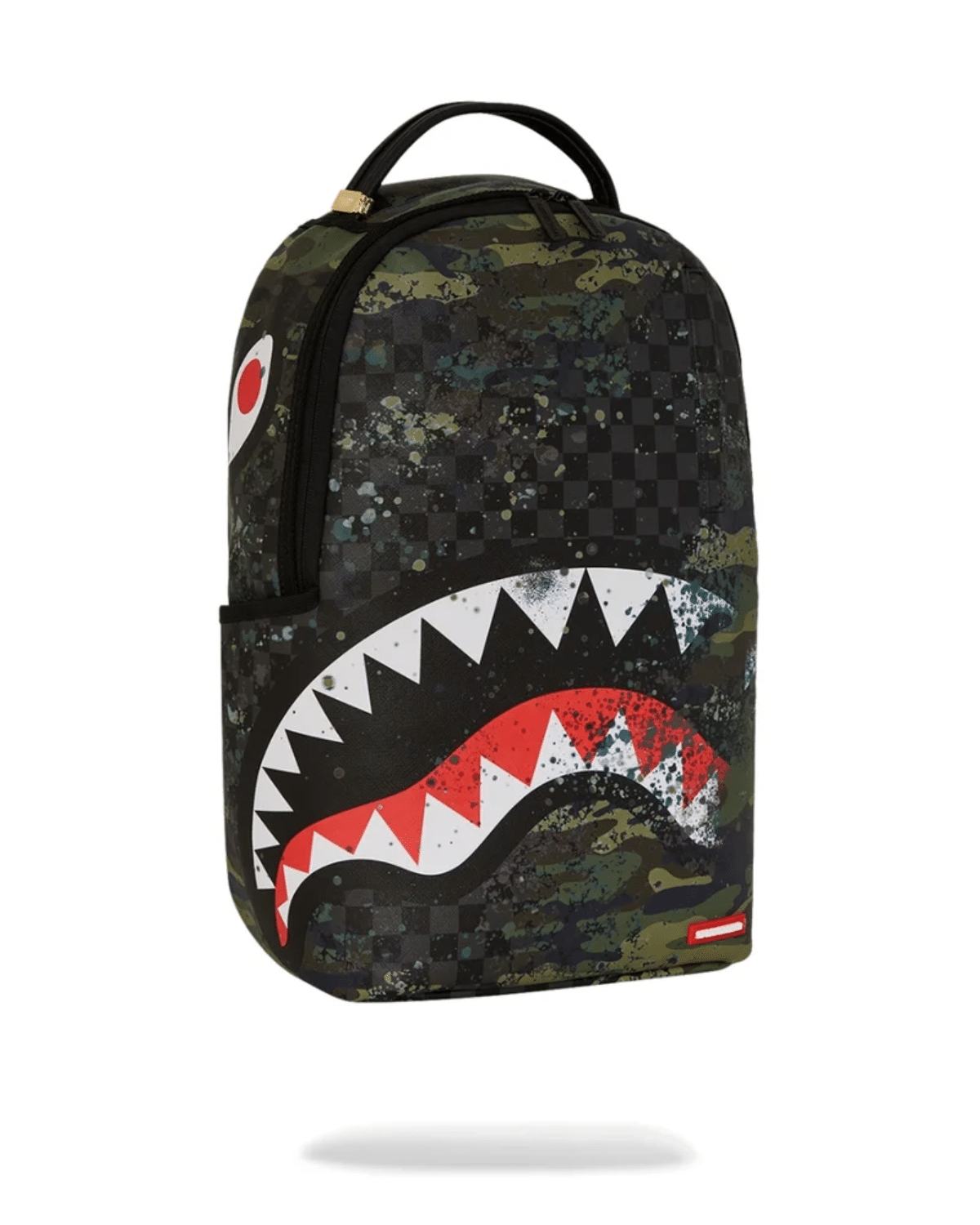 תיק גב יוניסקס מבית SPRAYGROUND בעיצוב מודרני עם הדפס קמופלאז' צבעוני ומרשים המשלב גוונים ירוקים ושחור.