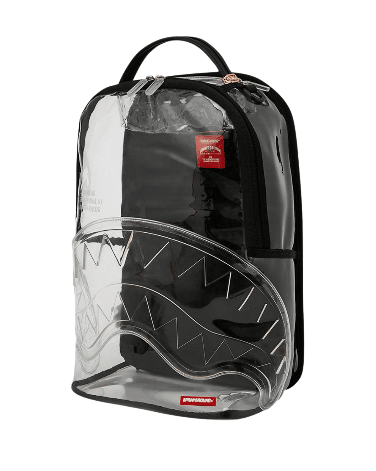 תיק הגב משלב עיצוב שקוף ייחודי בבליטת הכריש האייקוני של SPRAYGROUND, המעניק לו מראה בולט ובלתי מתפשר