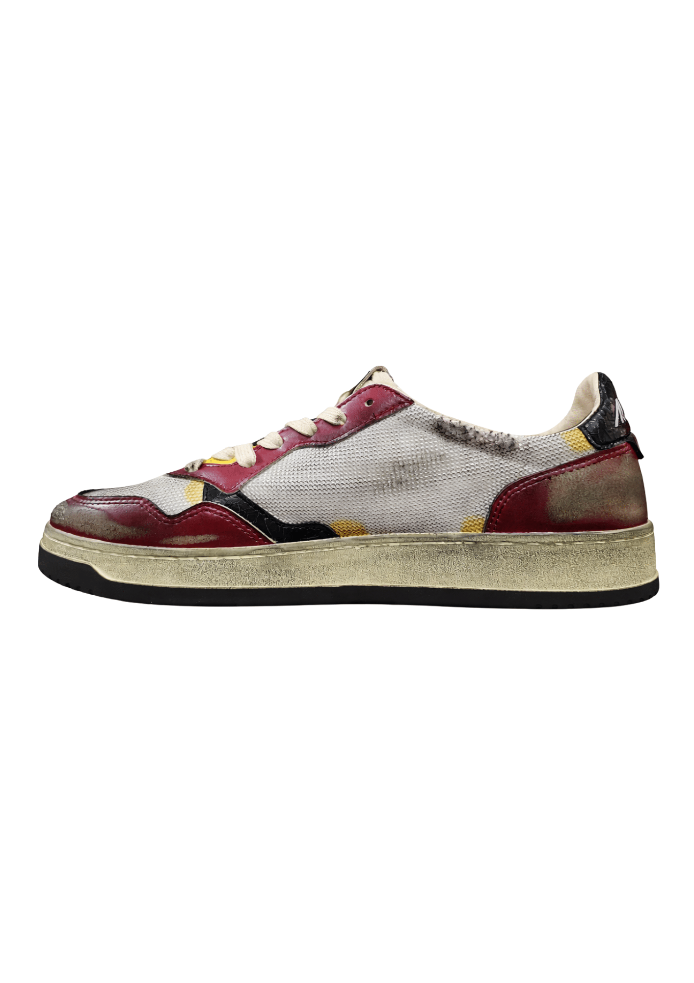 סניקרס לגברים בעיצוב וינטג’ מודגש עם אפקט “מלוכלך” ייחודי בגווני אדום, קרם ושחור.