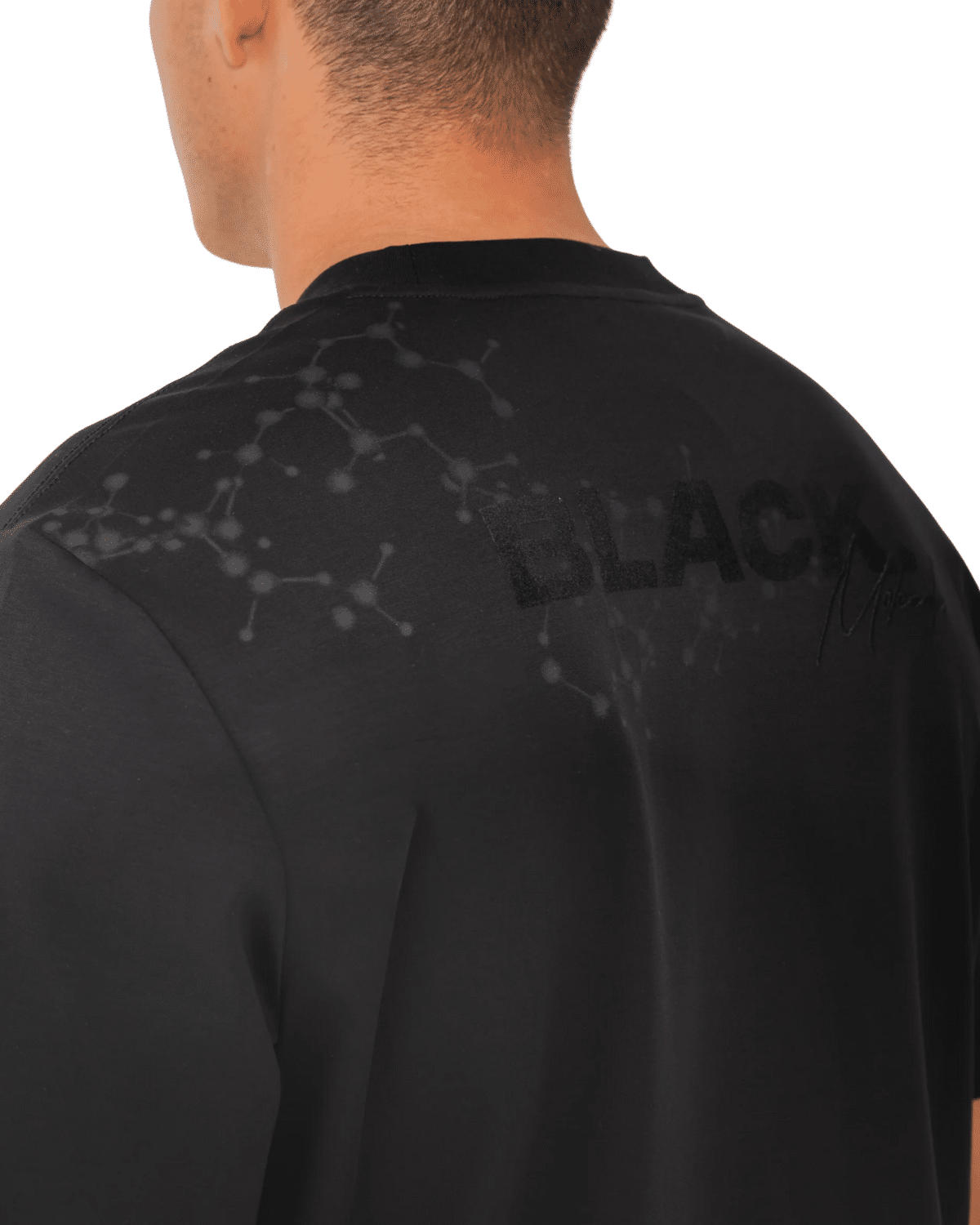 טי שירט גברים שחורה מבית BLACK DOT עם הדפסת לוגו גדול בחלק האחורי וגרפיקה קטנה בחזית שמוסיפים נוכחות בולטת