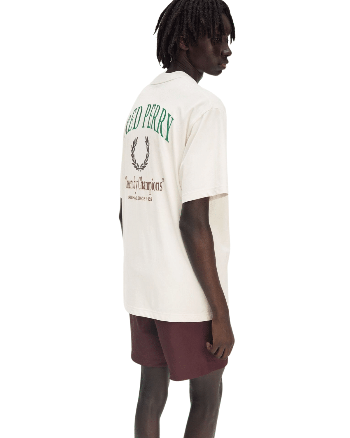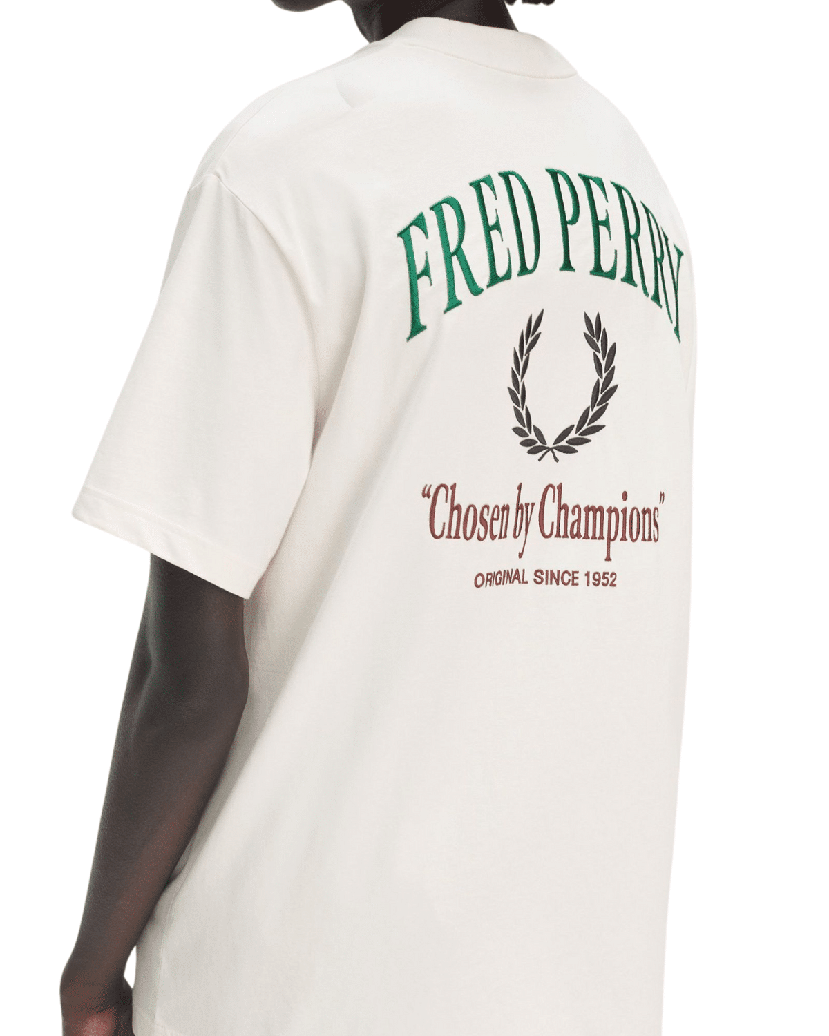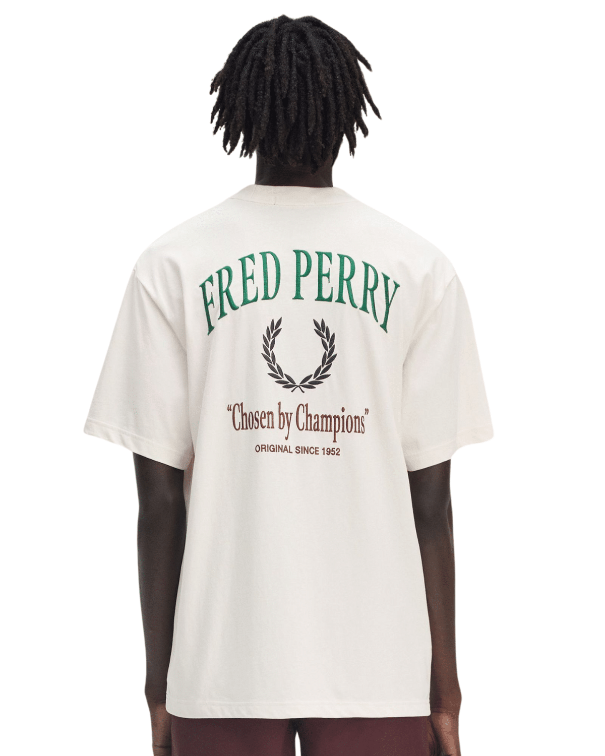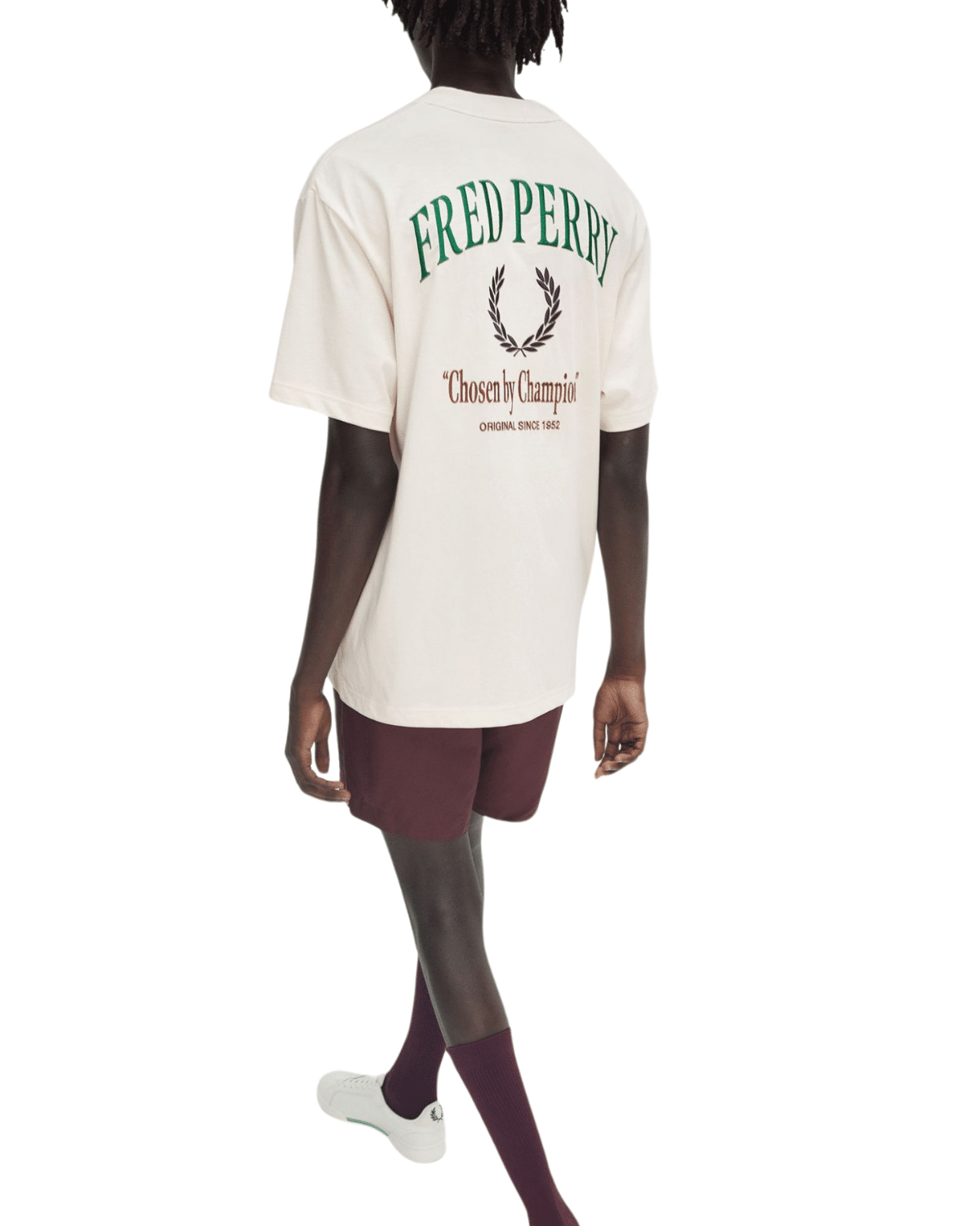 טי-שירט מעוצבת לגברים בגוון בז' טבעי, בעיצוב נקי מלפנים אך עם נוכחות מובהקת בגב – שם מופיעים כיתוב מודפס ולוגו איקוני שמבליטים את הזהות של FRED PERRY בצורה אלגנטית ובטוחה בעצמה.
