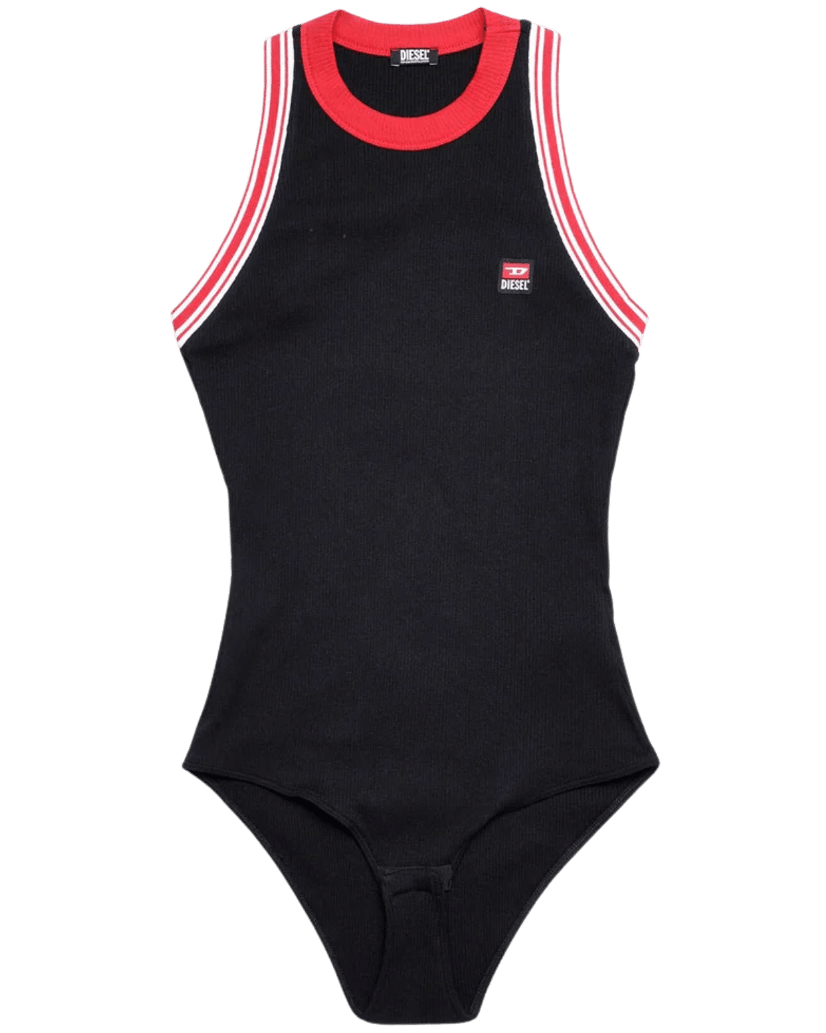 מסביב למחשוף ולכתפיים – גימורי ריב בצבע לבן-כחול להדגשת הקווים, עם לוגו Diesel קטן במרכז החזה בגימור דיסקרטי.
