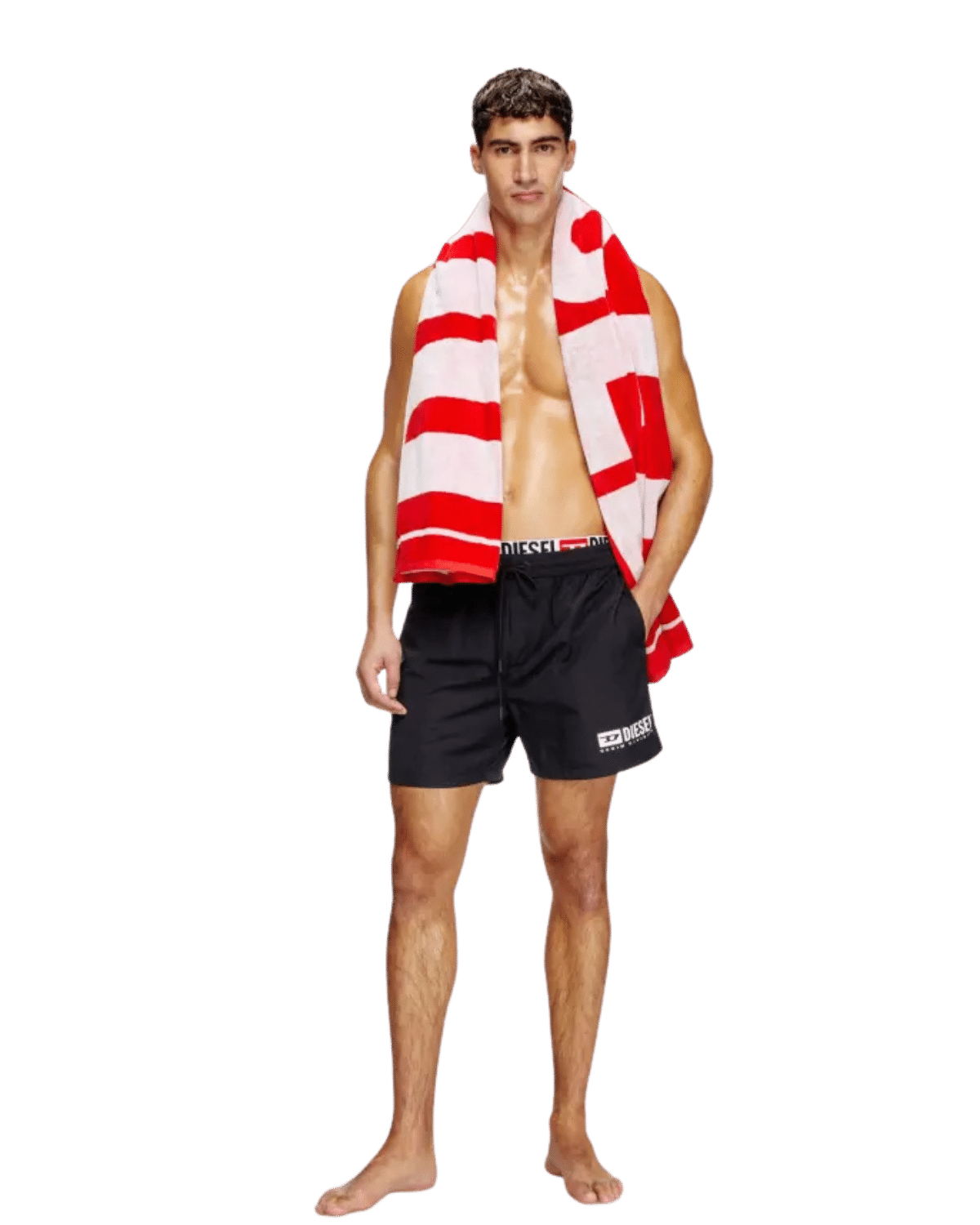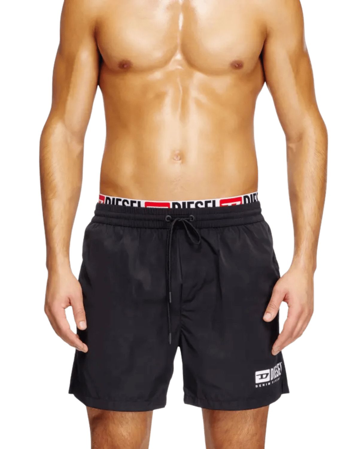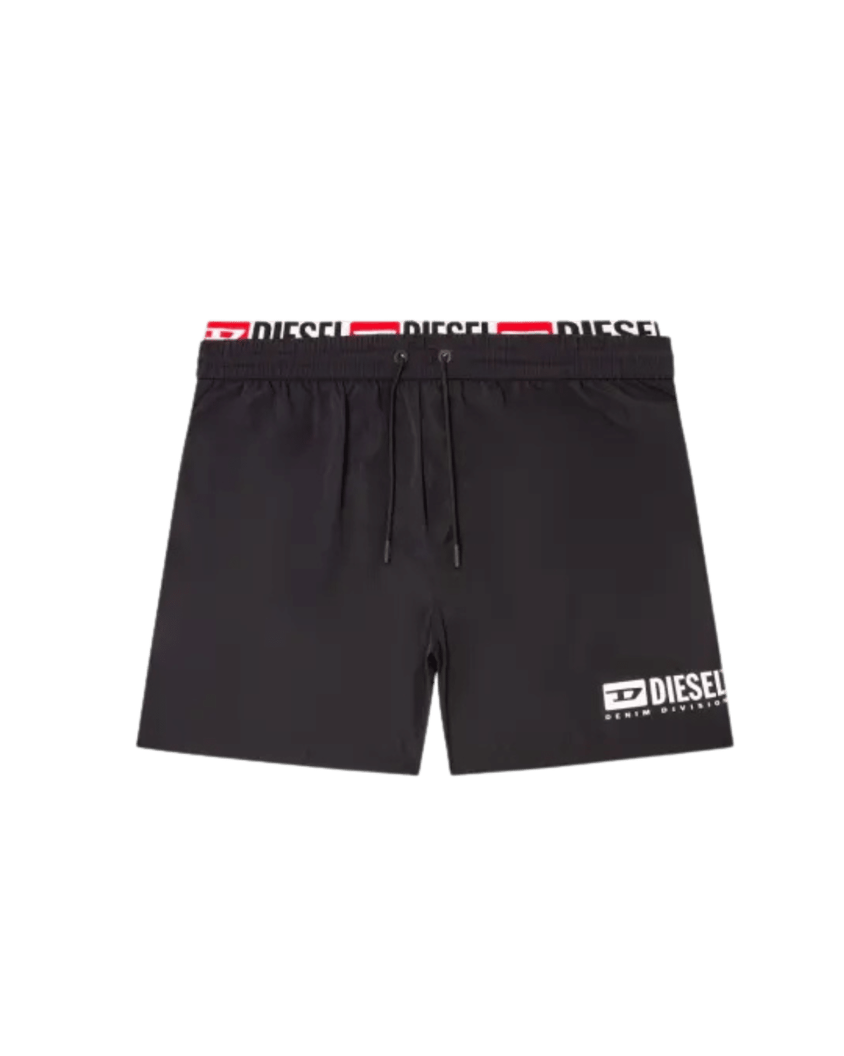מכנסי בגד ים קצרים בצבע שחור מבד שמתייבש בקלות, עם גומי כפול והדפס לוגו חוזר שמציץ חלקית מקו המותן.